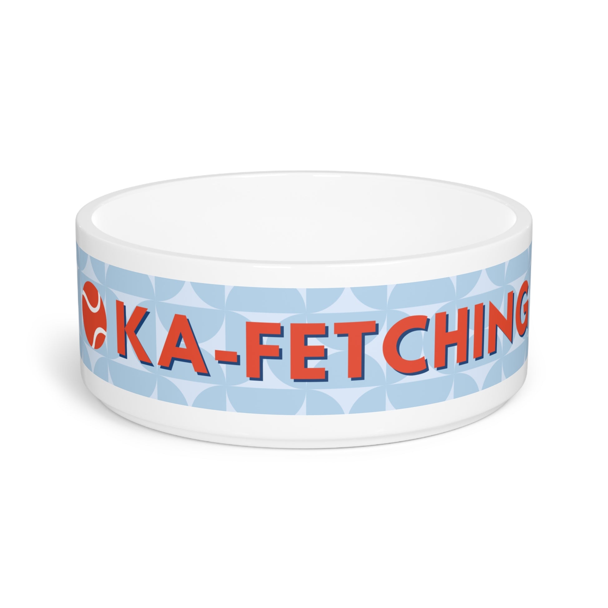 We created this bowl so your pet can NOSH with you! Each bowl reads "Ka-Fetching" with a light blue pattern on the front.