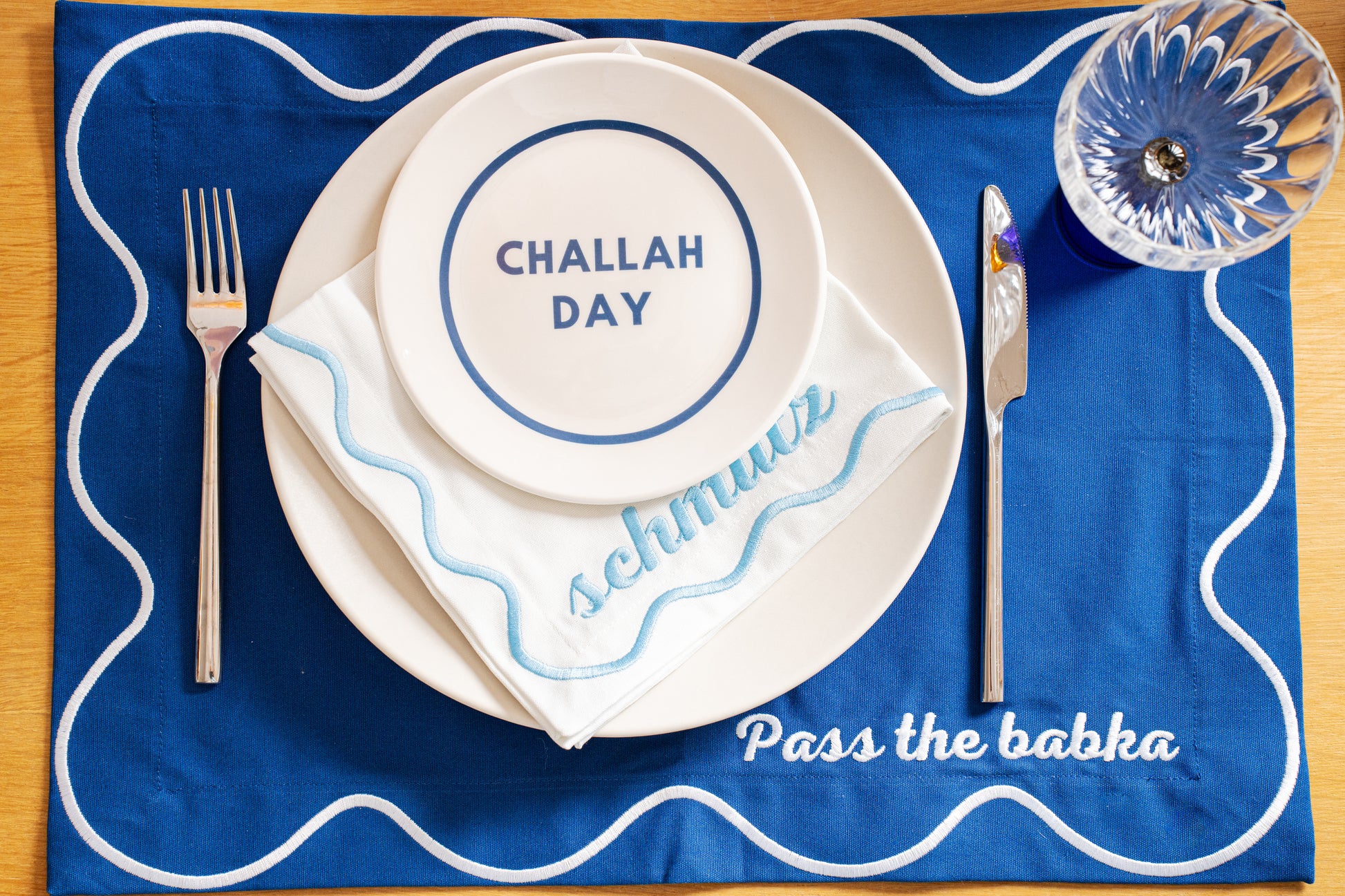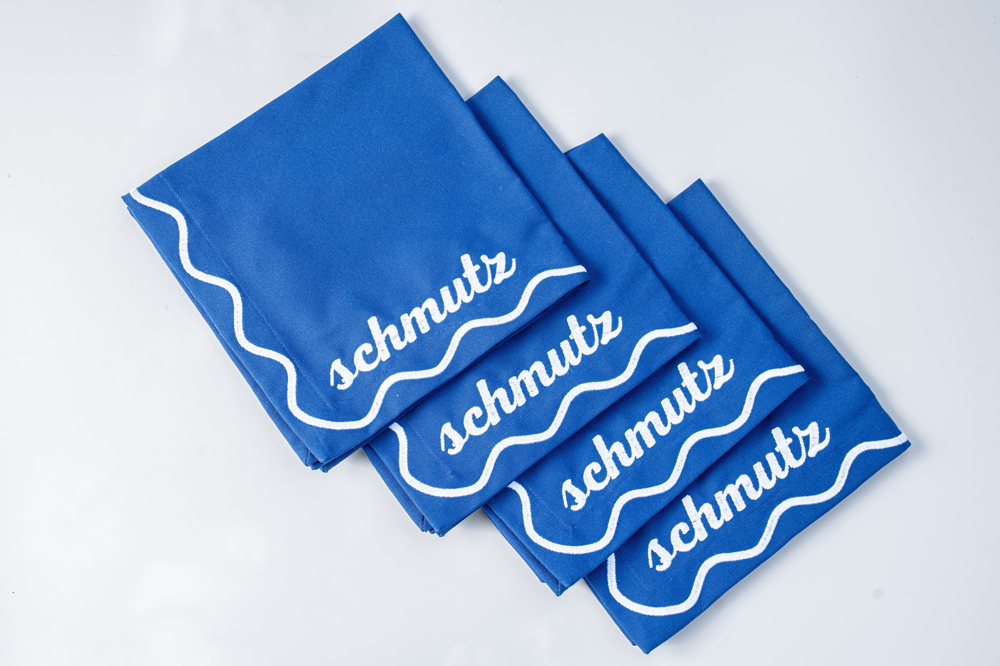 Napkins to impress your dinner party guests and wipe off the schmutz from Bubbe's brisket! Embroidered with a wavy border and designed with chutzpah in a thick high quality fabric.